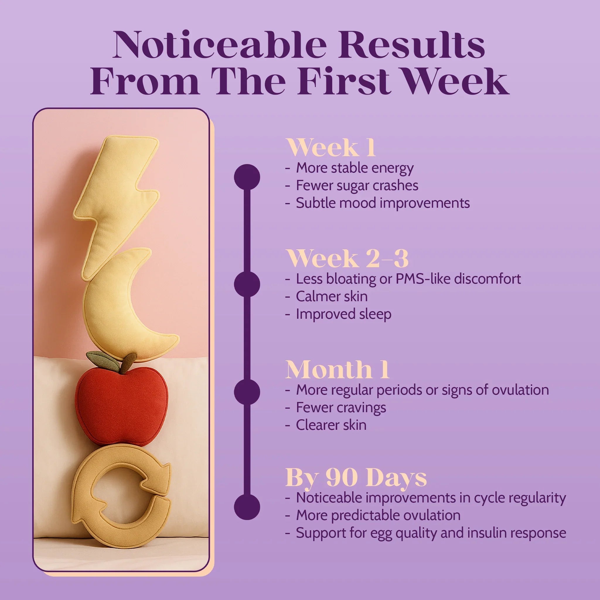 Most women begin to see benefits — such as more regular cycles, clearer skin, or fewer cravings — within 6 to 12 weeks. However, hormonal changes take time, and full effects may take up to 6 months, depending on consistency, individual biology, and lifestyle factors.